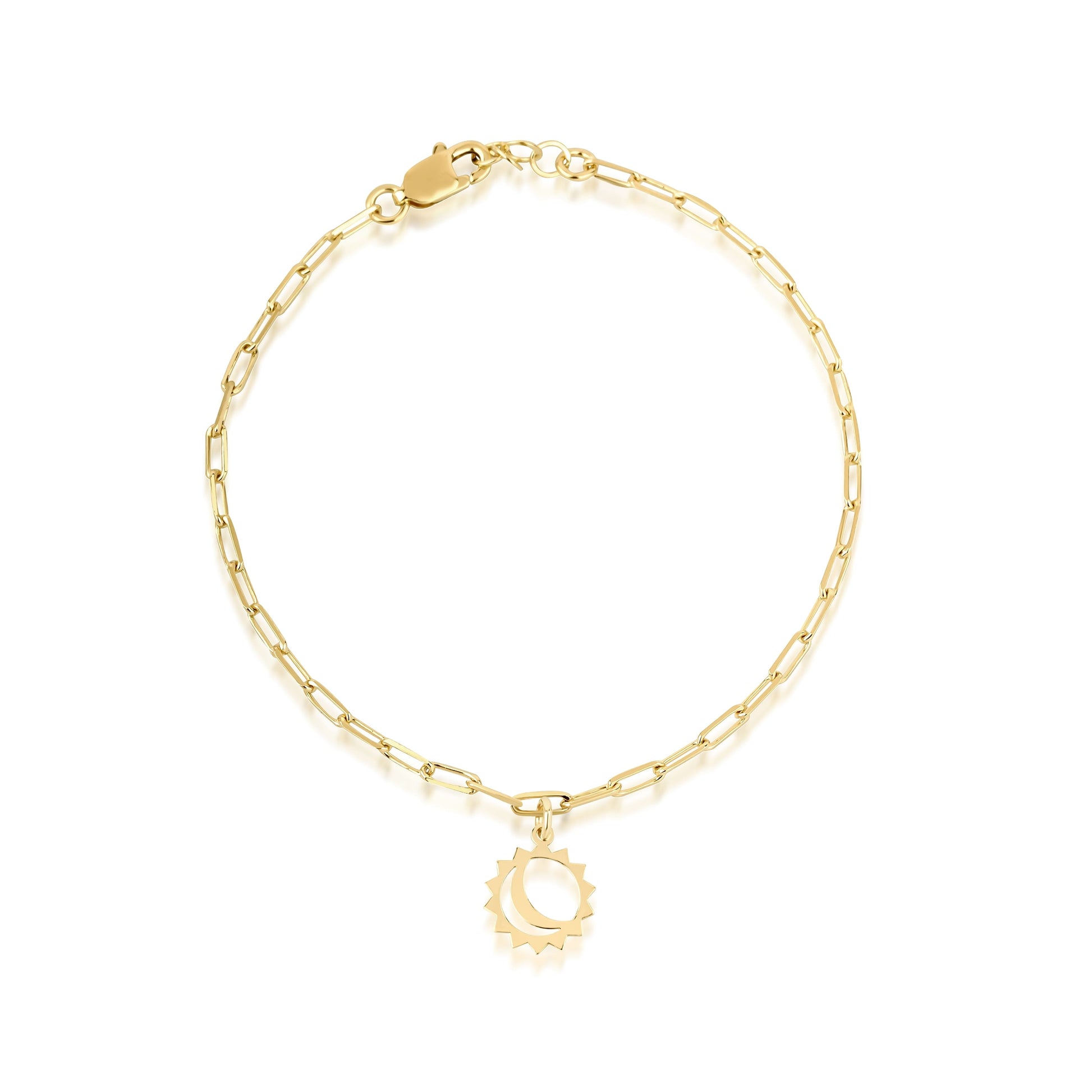 Celebrate the eternal bond of opposites with our 14K Gold Moon Sun Bracelet, designed on a modern paperclip chain for a chic, timeless look. The moon and sun together symbolize balance, unity, and two forces that can never be apart. Crafted in solid 14K gold, this celestial bracelet is a meaningful piece to honor your love, your best friend, or someone who brings light to your life. Perfect as an everyday jewelry staple or as a symbolic gift for special occasions.