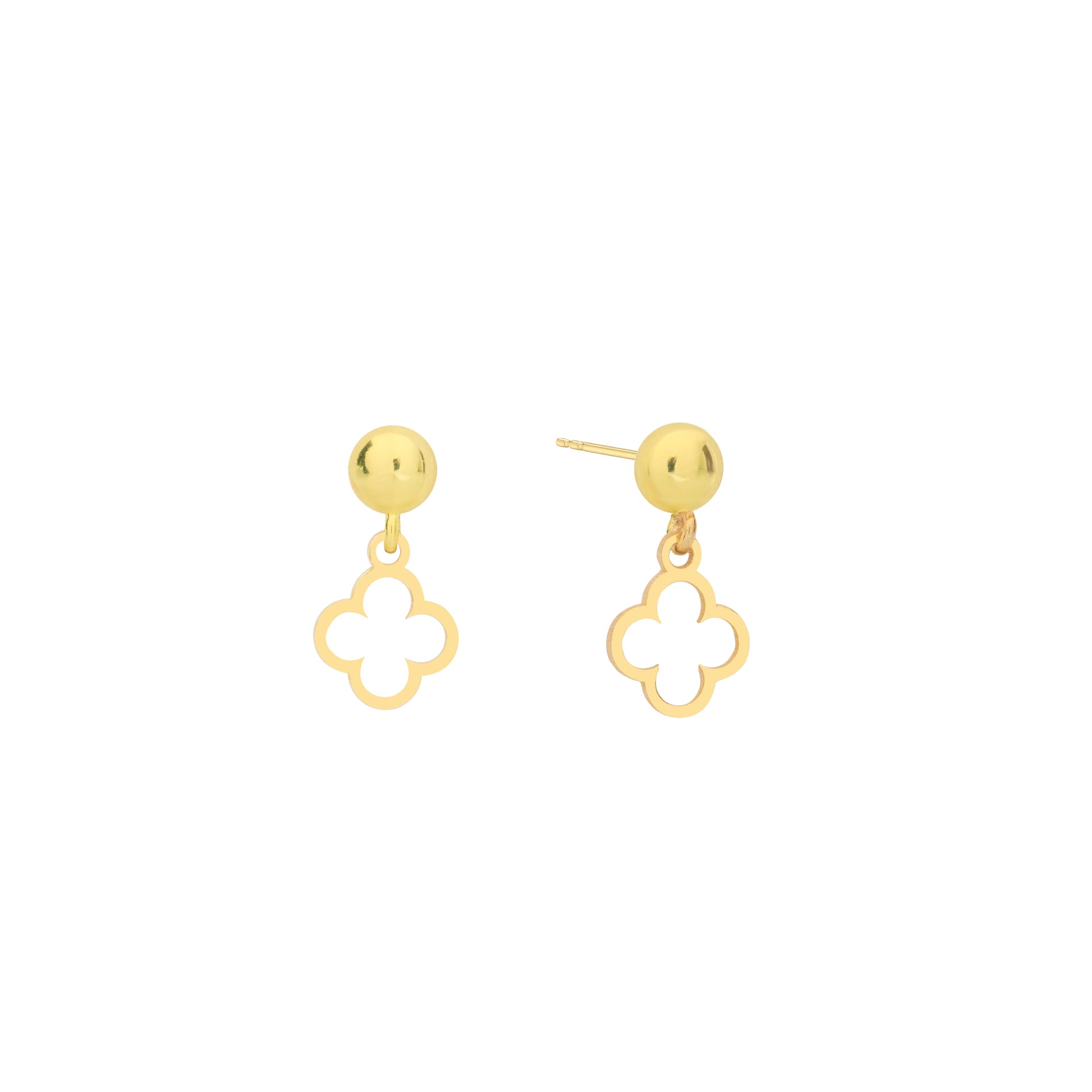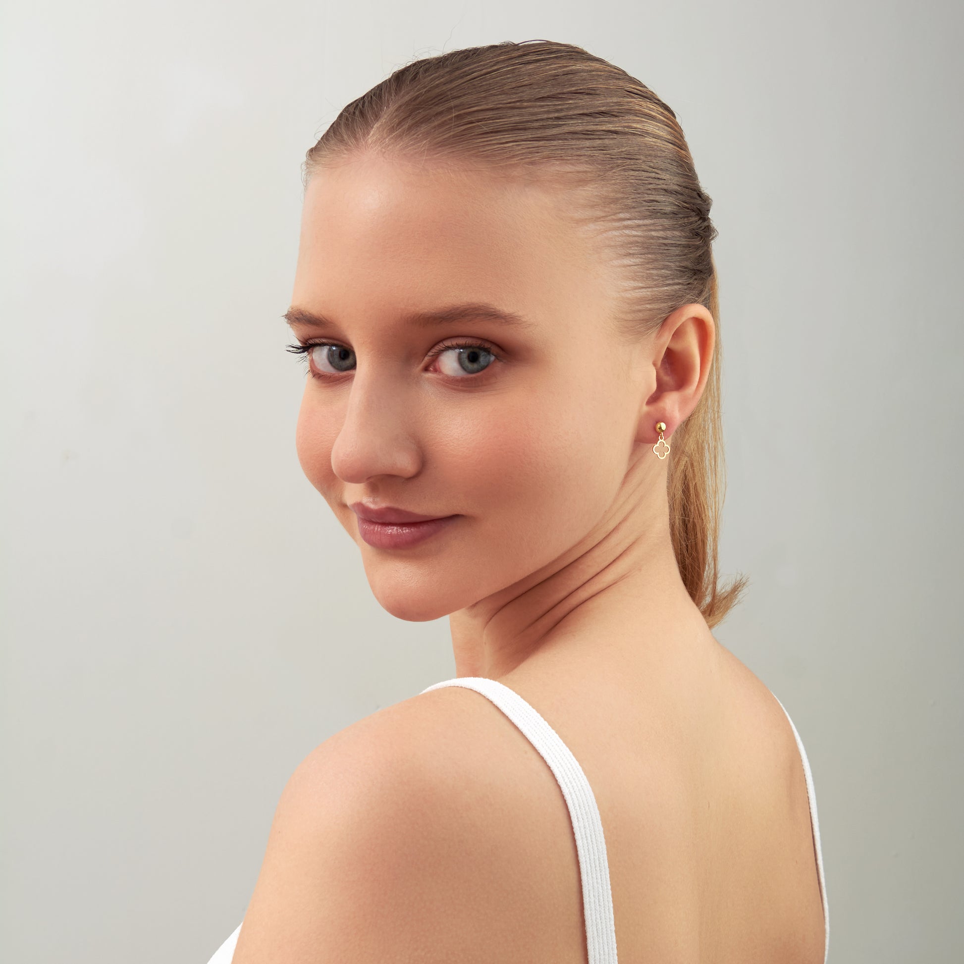 Handcrafted from real 14K gold (never plated or filled), these earrings feature a high-polish sphere stud with a dainty open clover charm that moves gently with every step.