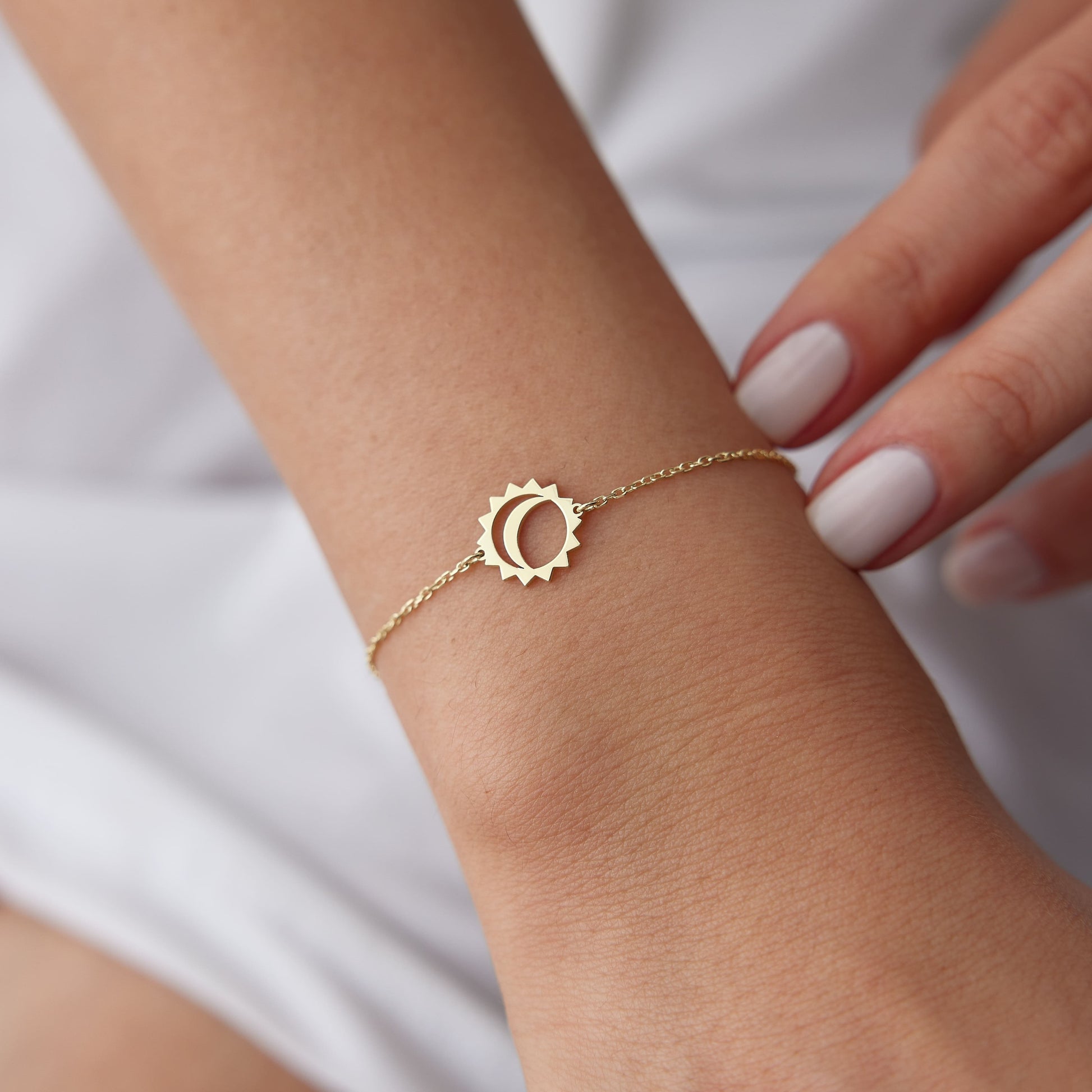 Our 14K Gold Moon Sun Bracelet beautifully captures the harmony of two inseparable forces. The moon represents calm and intuition, while the sun embodies strength and vitality. Together, they symbolize balance, love, and a connection that can never be broken. Crafted in solid 14K gold, this dainty celestial bracelet is a timeless gift for someone special — whether it’s your best friend, your partner, or someone who brings light into your life. Perfect for everyday wear or as a meaningful keepsake.