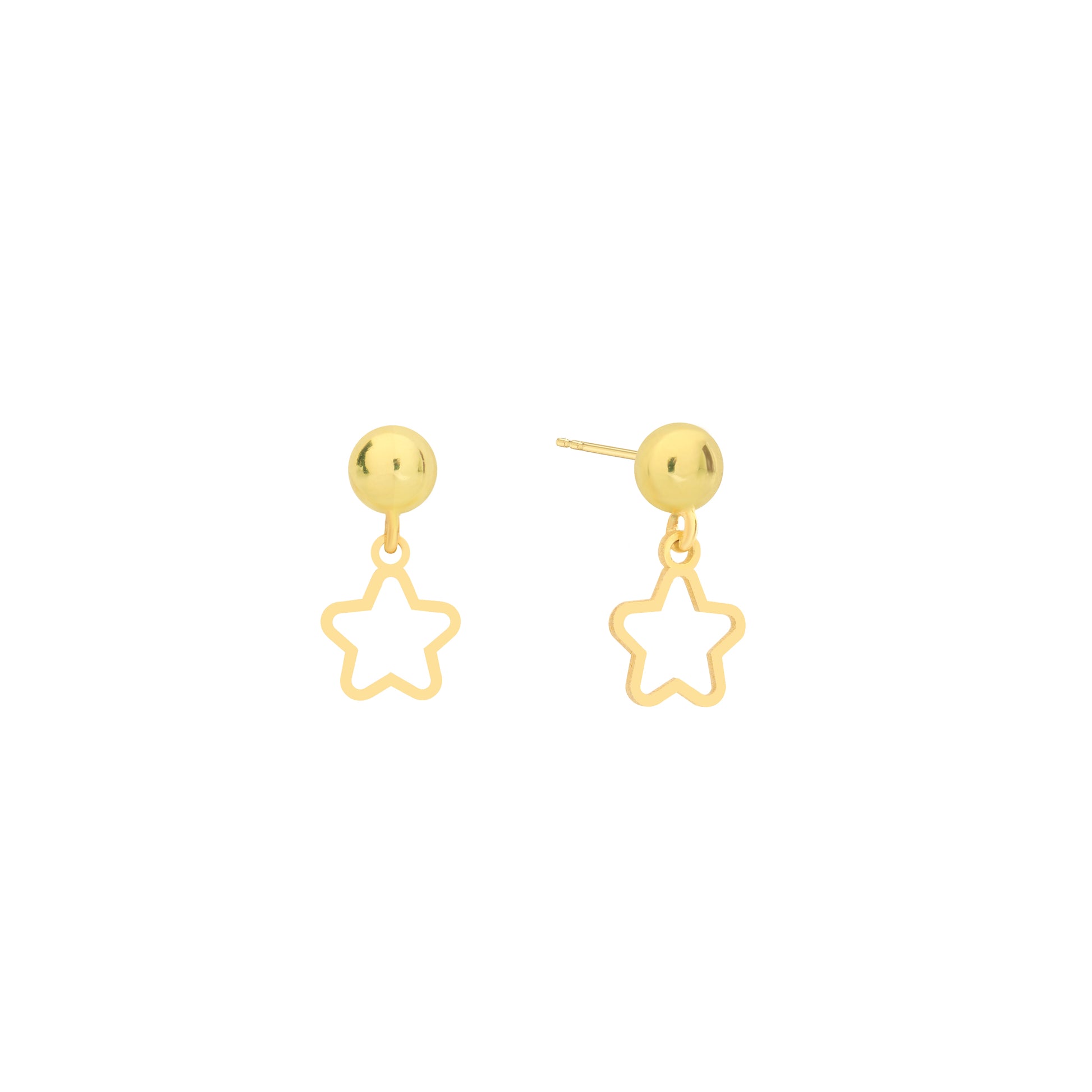 Each earring is handcrafted from real 14K gold (never plated or filled) and polished to perfection, featuring a dainty open star charm that dangles lightly beneath a smooth gold stud.